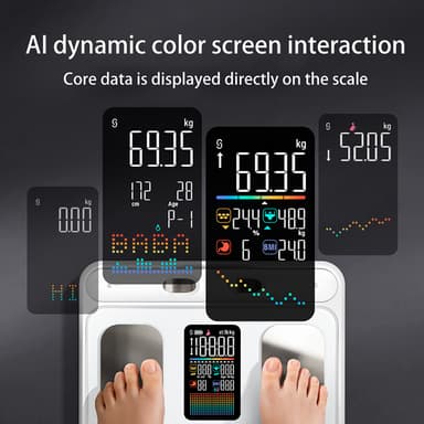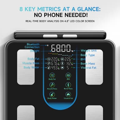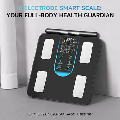 Omfattende kroppsanalyse: Denne smarte kroppsfettvekten bruker avansert bioelektrisk impedansanalyse-teknologi (BIA) med 8 elektroder for å gi en omfattende analyse av kroppssammensetningen din. Den måler ikke bare vekten din, men også kroppsfettprosent, muskelmasse, vannprosent, beinmasse, visceralt fett, basalmetabolisme (BMR) og mer. Få et komplett bilde av din helse og form med 45 profesjonelle målerapporter tilgjengelig via den dedikerte appen. Denne detaljerte innsikten lar deg spore fremgangen din og ta informerte beslutninger om kosthold og treningsrutine.