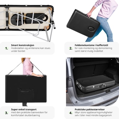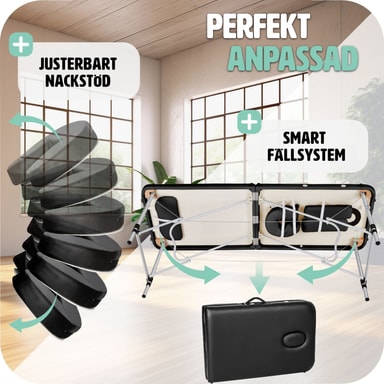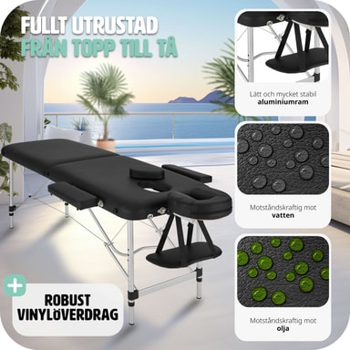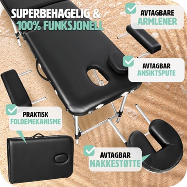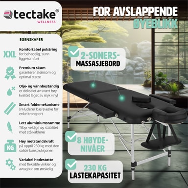 Dette transportable massasjebordet fra tectake er perfekt for massører og fysioterapeuter. Bærevesken gjør den både praktisk og behagelig mens den lette, sammenleggbare aluminiumsrammen gjør massesengen enkel å løfte og transportere. Til tross for den lette rammen, mangler massasje-benken absolutt ikke styrke, stabilitet eller komfort. Takket være den ekstra tykke polstringen, vil klienten føle seg avslappet og komfortabel gjennom hele behandlingen. Når behandlingen er avsluttet, gjør det olje- og vanntette vinyldekselet enkelt å rengjøre. Sengen er også justerbar for å passe både massørens og klientens behov, for eksempel høyde og kroppstype. Den ergonomiske nakkestøtten øker komforten ytterligere og har avtakbar polstring for økt hygiene. Dette massasjebordet med tilbehør fra tectake er et fantastisk tillegg til ethvert terapi-studio eller skjønnhetssalong.