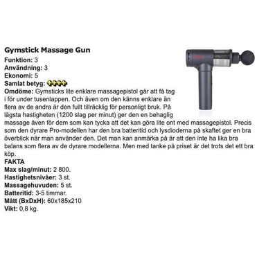 Gymstick massasjepistol hjelper til med å lindre anspente muskler, ømhet og stiv rygg. Den er perfekt for både personlig og semi-profesjonell bruk, noe som betyr at den også kan brukes av fysioterapeuter eller kiropraktorer.Les mer om produktet