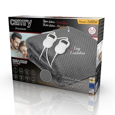Camry Det elektriske teppet fra gir deg avslappende varme og komfort. Det elektriske teppet hjelper musklene dine med å slappe av og kan forbedre blodsirkulasjonen. Teppet gir deg rask og jevn varmefordeling og gjør at du kan hvile med glede i en varm seng på bare noen få minutter etter at du har slått på det elektriske teppet. Teppet er laget av mykt polarstoff. Du kan enkelt vaske det etter at du har fjernet temperaturkontrollen og strømledningen. Temperaturkontrollen lar deg velge temperaturnivå. Varmeteppet har en effekt på 60 W og lar deg velge mellom 8 temperaturnivåer. Det er også utstyrt med en timer som lar deg stille inn varmeperioden fra 1 til 10 timer.