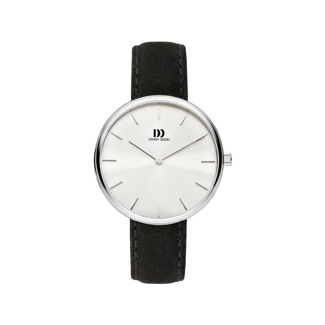 Denne enkle danske design klokke har en gull farget rustfritt stålkasse med en ren hvit urtavle, mineral krystallglas og en svart lær rem.
