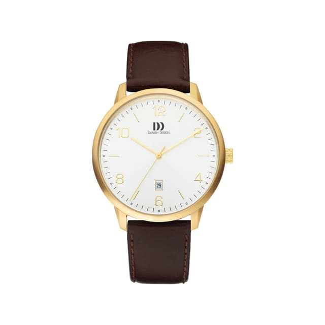 Dette er en enkelt og klassisk klokke fra danish design har en gull farget rustfritt stålkasse med hvit urtavle, datodisplay, mineral krystall glass og en brun lær rem.
