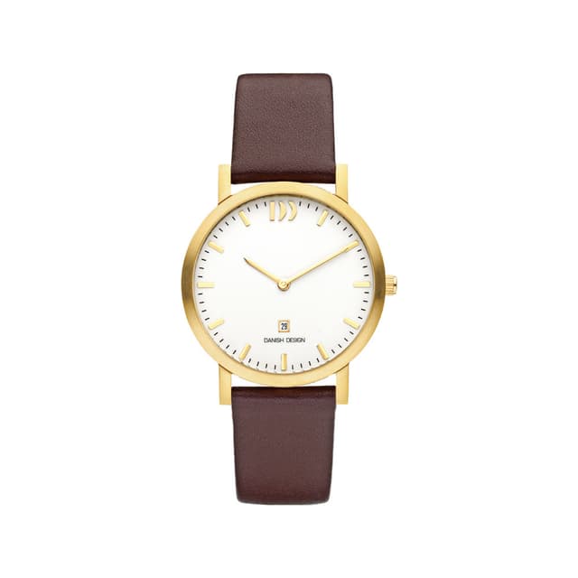 Denne enkle og stilige klokken fra danish design kan gjøre ethvert antrekk komplett. Denne klokken har en gull farget rustfritt stålkasse med hvit urtavle, datodisplay, mineral krystallglass og en brun lær rem.