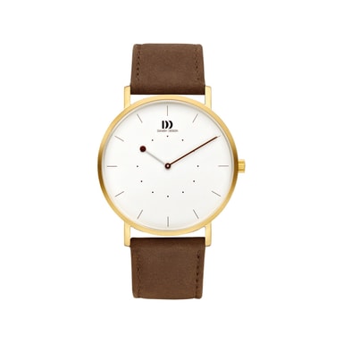 Denne klokken er hva danish design handler om, klassisk og enkel i design med vri. Klokken har en gull farget rustfri stålkasse med hvit urtavle, mineral krystallglas og en brun lær rem.