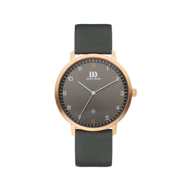 Med dette unikt designet urkasse får du en unik klokke. Denne danish design klokken har en firkantet gullfarget rustfri stålkasse med grå urtavle, datodisplay, mineral krystallglas og en grå lær rem.