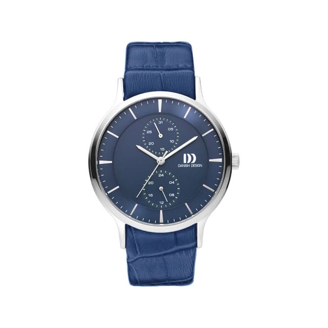 Dette danish designuret har rustfritt stålkasse med en blå urtavle og to sub urtavler for 24 timers og dato. Denne vakre klokken har også mineral krystall glass og en blå lær rem.