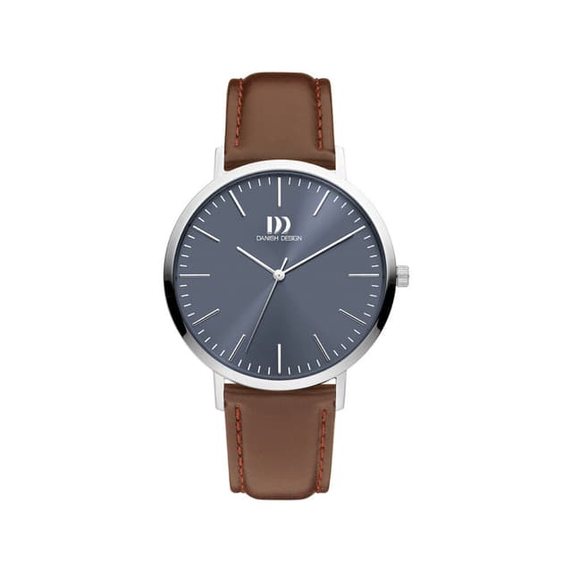 Enkel og klassisk. Denne klokken fra danish design har en rustfri stålkasse med en blå urtavle som viser timer, minutter og sekunder. Klassisk look er laget med en blå urtavle, en brun lær rem og safir krystall glass.