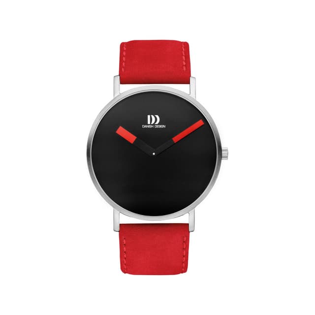 Dette er en enkelt og klassisk klokke fra danish design har en rustfri stålkasse med en ren svart urtavle, mineral krystall glass og en rød lær rem.