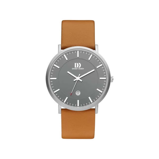 Gi ditt utseende litt farge med denne klokke fra danish design. Klokke egenskaper, rustfri stålkasse med grå urtavle, dato display, mineral krystallglas og en brun lær rem.