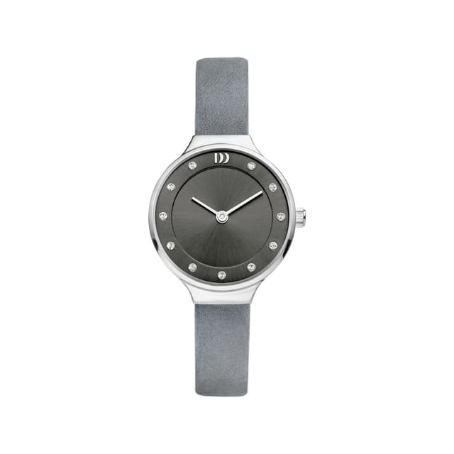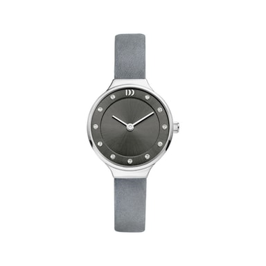 Med zirconer som timemarkører får du en vakker ""touch"" til en feminin klokke. Denne klokke fra danish design har en rustfri stålkasse med grå urtavle, mineral krystallglas og en grå lær rem.