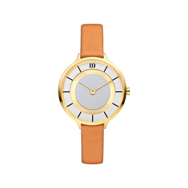 Denne klokken fra danish design gjør det klart at dette merket handler om å bruke små detaljer for å lage vakre klokker. Denne klokken har en gull farget rustfri stålkasse med grå og gull urtavle, mineral krystallglass og en brun lær rem.