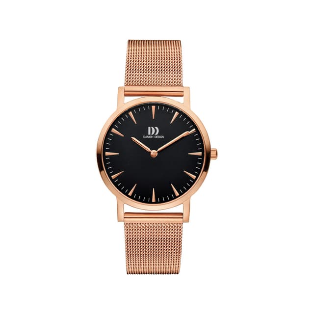 Dette er en enkelt og klassisk klokke fra danish design har en rosegull farget rustfritt stålkasse med svart urtavle med silver visere og timemarkers, mineral krystall glass og en flettet rustfri stålrem.
