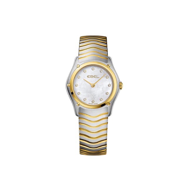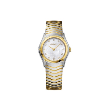 Ebel klassisk dame automatikk klokke, 27,3 mm rustfri stålkasse med 18k rød gullinnfatning og krone, hvit perlemor urtavle med 12 diamantmarkører (0.055 tcw) og dato display, børstet og polert totonet rustfri stålsignatur wave-link stållænke med spenne.