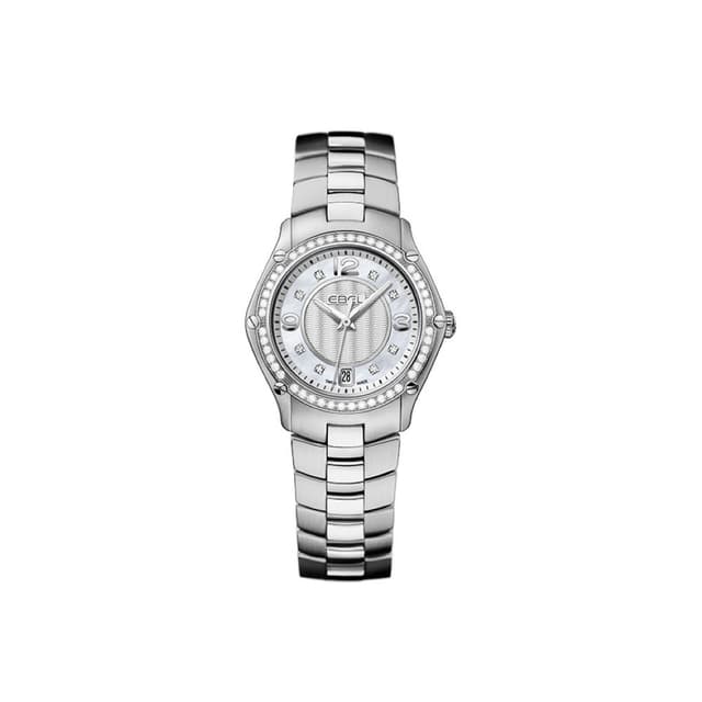 Ebel dame sport klokke, rustfri stål, ø 27.0mm, hvit urtavle med påførte arabiske tall og 56 diamanter (0,0343 ct), safir krystall med antireflekterende behandling under, to-tone rustfri stållænke med spenne, swiss kvarts urverk, vannbestandig opptil 50 meter.