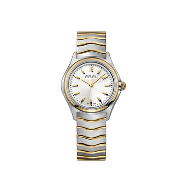 Ebel wave dame klokke, 30,0 mm rustfri stål og 18k gul gullkasse, sølvgalvanisk urtavle med påført ebel symbol og indekser, børstet og polert to-tonet rustfritt stålsignatur wave-link stålrem med spenne.
