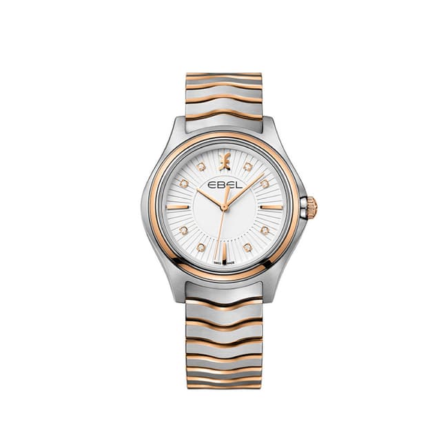 Ebel wave grande dame automatikk klokke, 35,0 mm rustfritt stålkasse med 18k rød gullkant og krone, silver galvanic urtavle med 8 diamantmarkerør (0.052 t.c.w.) påført ebel symbol og indekser, børstet og polert totonet rustfri stål signatur wave-link stålrem med spenne.