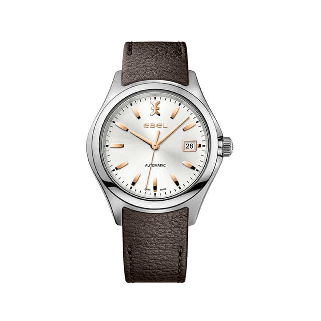 Herre ebel wave gent automatikk klokke med 38-timers kraftreservoar, 40,0 mm børstet og polert rustfritt stålkasse, sølvgalvanisk urtavle med påført ebel-symbol og indekser, og datovisning, brun kalveskinn rem med stål rem.