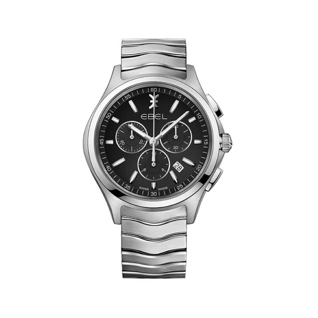 Herre ebel wave chronograph, 42,0 mm børstet og polert rustfritt stålkasse, svart galvanisk urtavle med matchende sub urtavler og arabisk minutt reflektor, sølvfargede applikerte ebel symbol og indekser, lysende detaljer og dato display, svart kalveskinn rem med matchende top-søm og rustfritt stål spenne.