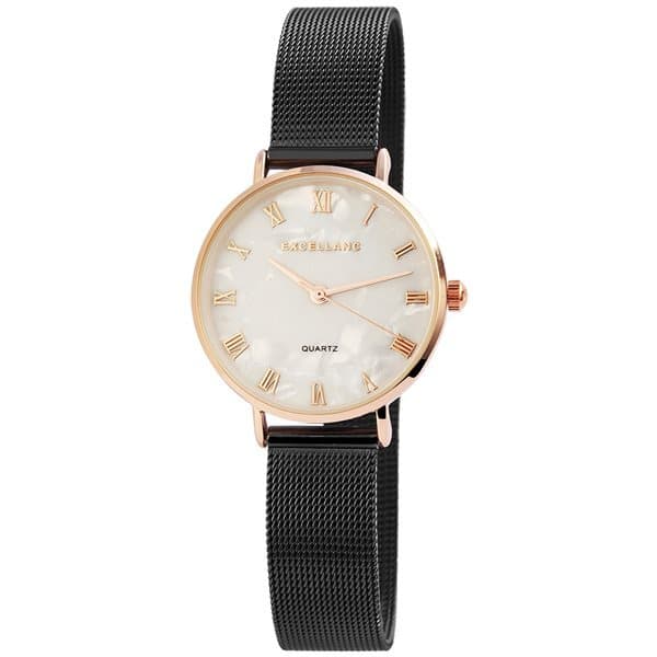 Analog dameklokke fra Excellanc. Mesh-armbåndet i rustfritt stål er 14 mm bredt og åpnes med hakelås. Total lengde er 17,5 cm. Metallhuset med mineralglass har dimensjonene 32 mm og en høyde på 7 mm. Huset er laget av rustfritt stål.