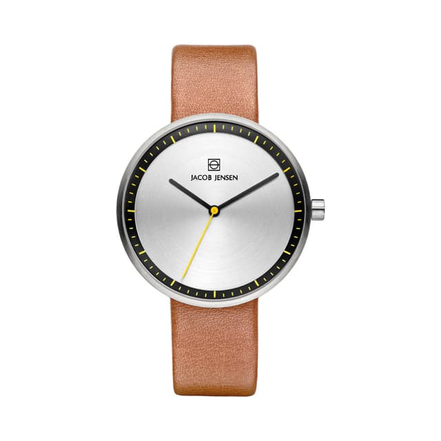 Den prisbelønte strata klokke-samlingen er designet for å imøtekomme fleksibiliteten i dagliglivet. Den lett byttbare lær rem er tydelig synlig på siden av kassen som gir klokken et særpreget estetisk uttrykk. Strata klokken kombinerer klassisk design, funksjonalitet og materialer av høy kvalitet, en ikonisk klokke laget av jacob jensen design studio.