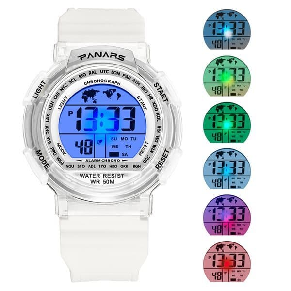 Flott digital armbåndsklokke med fargeglad lysende display. Nett modell med behaglig armbånd i høykvalitativt plastmateriale.