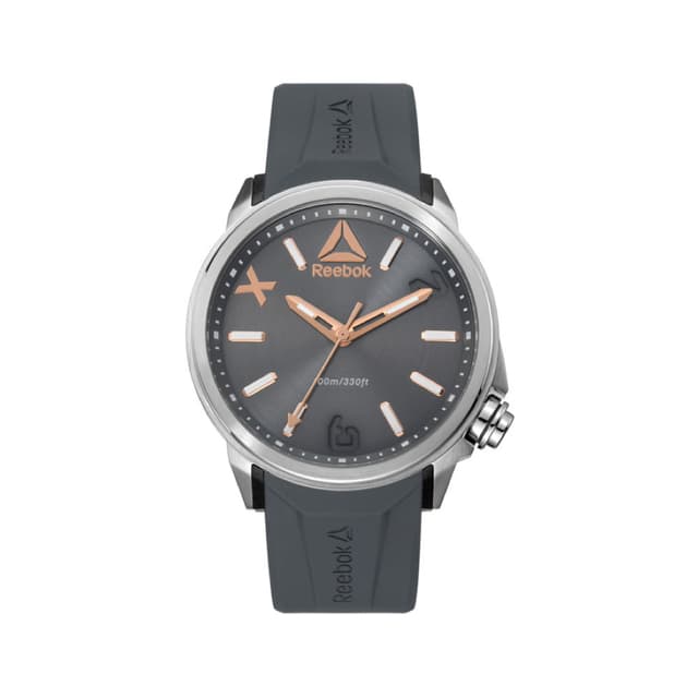 Reebok flashline-klokke er laget med et rustfritt stål etui og en silikonrem av høy kvalitet, den gir oppmerksomhet til detaljer inspirert av reebok delta-logoen. Flashline-klokken, med vannmotstand opp til 10 atm, er den perfekte følgesvenn for den aktive mannen fra kontor til treningsstudio og fra jobb til å trene.