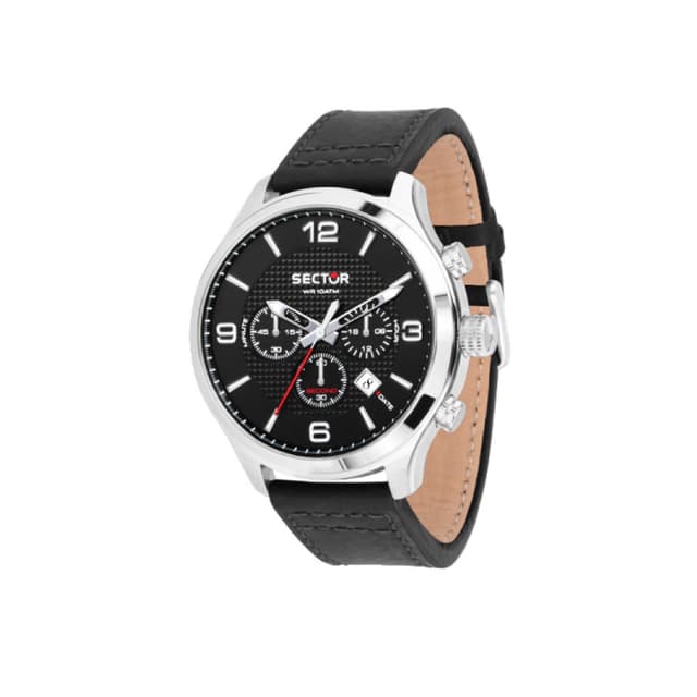 Materiale og finish: rustfritt stål, lær, kasse størrelse: 54,8x48mm, sakstykkelse: 11,65, skivefarge: svart, krystall: mineralsk krystall, stropp materiale: lærrem, stropp farge: svart, bevegelse: kvarts, låsetype : spenn, vannbestandig: 10 atm, garanti: sektor 2 års garanti, emballasje: sektor originalemballasje