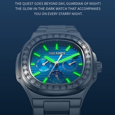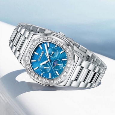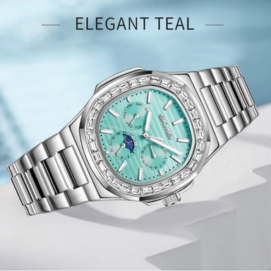 SKMEI 7076 Business Men Quartz Watch Ottekantet zirkondekor Motearmbåndsur - sølv armbånd/cyan urskive Motedesign: Zirkondekorert åttekantet urveskedesign, eksklusivt og elegant lett å bære: Dobbeltpresset sommerfuglspennedesign, presisjonspolert overflate, passer til håndleddet, lett å bære og ta av 30 meter Vanntett: Oppfyller enkelt daglige vanntette behov, kan enkelt bæres for å vaske hender, vaske ansikt og regn sprut 3 små urskiver: Med tre små ringer for å vise ukedag, dato, 24-timers system/månefase