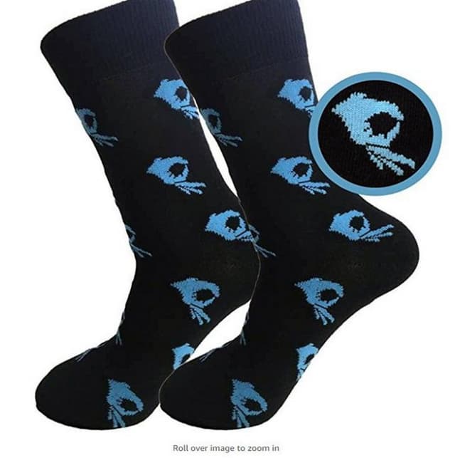Sokkene kommer i en 3-pakning, og hvert par har forskjellige trykkfarger. Sokkene er svarte, men har trykk i gult, blått og rosa.