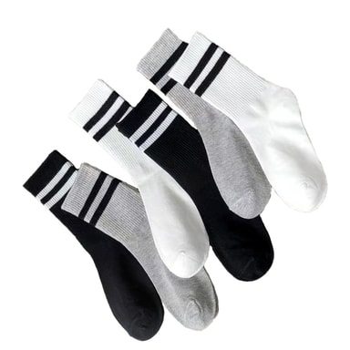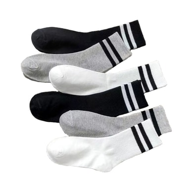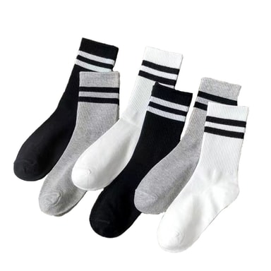 Allsidig stil: Disse sokkene har en klassisk mid-legglengde og et stilig stripete design i svart, hvitt og grått, og komplementerer enkelt en rekke antrekk og anledninger.