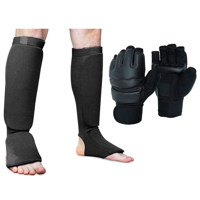 Vårt verneutstyr er laget av en kombinasjon av slitesterkt nylon og myke svampmaterialer, og tilbyr både fleksibilitet og slagfasthet. Settet inkluderer et par fotbeskyttere for å skjerme føttene og leggen under intense sparringøkter, samt et par hansker for å beskytte hendene dine.