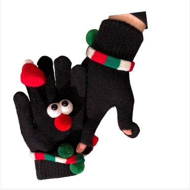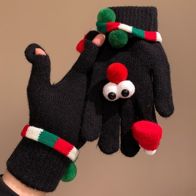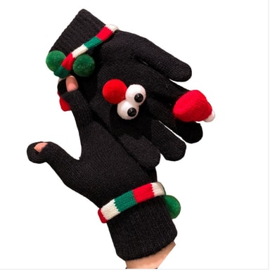 Unik design: Skill deg ut fra mengden med det unike og lekne designet til disse julehansker med store øyne. De iøynefallende detaljene og de livlige fargene gjør disse hanskene til et morsomt og moteriktig tilbehør som garantert vil vekke oppsikt. Det intrikate strikkemønsteret gir et snev av raffinement, mens plysjaksentene forbedrer den generelle estetiske appellen. Enten du deltar på en julefest eller bare vil legge til et snev av lunefullhet til hverdagsutseendet ditt, er disse hanskene det perfekte valget. De er en flott samtalestarter og en morsom måte å uttrykke din personlige stil på.