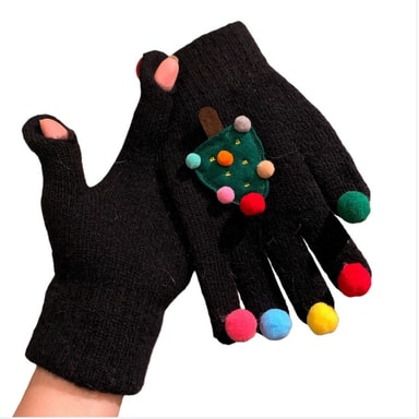 Festlig juledesign: Omfavn julestemningen med disse bedårende juletre-strikkehanskene. Det unike designet har en sjarmerende juletrepynt som gir et snev av festlig glede til vintergarderoben din. Disse hanskene er perfekte for å spre juleglede og gjøre et statement i julesesongen. Det intrikate strikkemønsteret og de livlige fargene på juletreet skaper et visuelt tiltalende og iøynefallende tilbehør, som sikrer at du skiller deg ut fra mengden mens du holder deg varm og koselig. Ideell for julebord, vinterfestivaler eller bare for å legge til et festlig preg på hverdagsantrekket ditt.