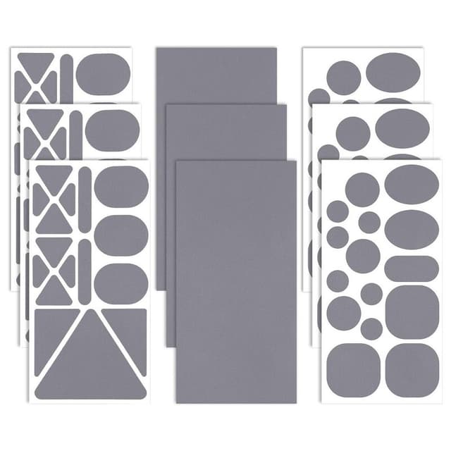 9 x ark med reparasjonslapper i forskjellige former og størrelser