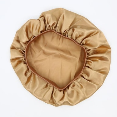 Bred myk strikk: Sovehetten sitter komfortabelt og sikkert på hodet takket være det brede elastiske båndet som ikke presser mot huden. Silkematerialet føles mykt og glatt.