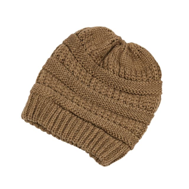 Denne strikkeluen har en praktisk åpning på toppen, slik at du kan ha håret i hestehale eller knol mens du holder deg varm. Luen er laget av akrylull og gir både varme og stil, noe som gjør den til et perfekt tilbehør for høst- og vintersesongen.