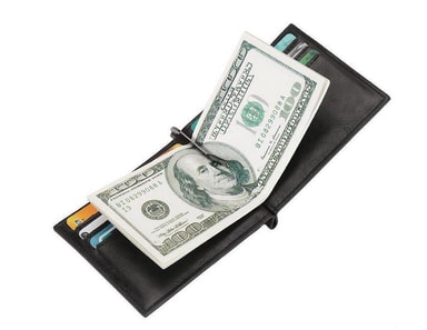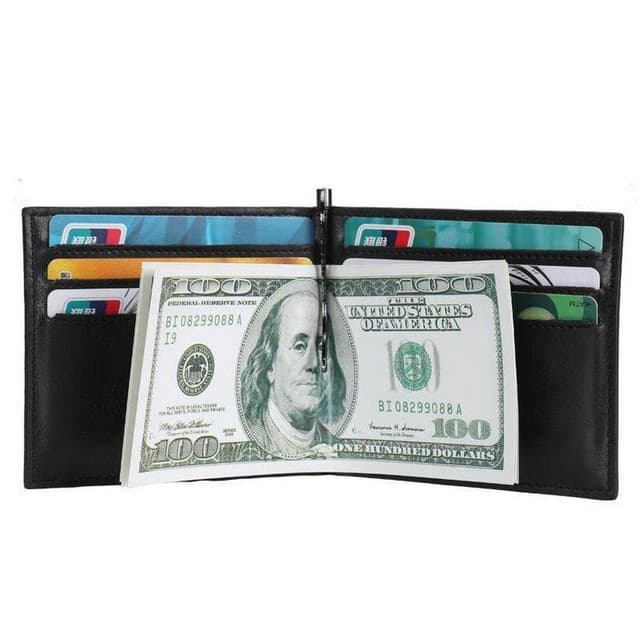 Fin lommebok i skinn, med plass til 6 kort og med seddelklemme for å sikre kontanter eller kvitteringer.