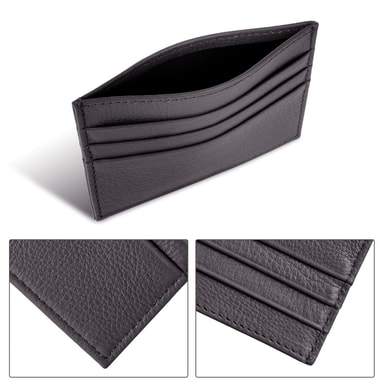 Praktisk kortholder i ekte skinn med plass til opptil 6 kort og et ekstra rom til for eksempel kvitteringer eller sedler. Kortholderen er supertynn og får enkelt plass i lommen.