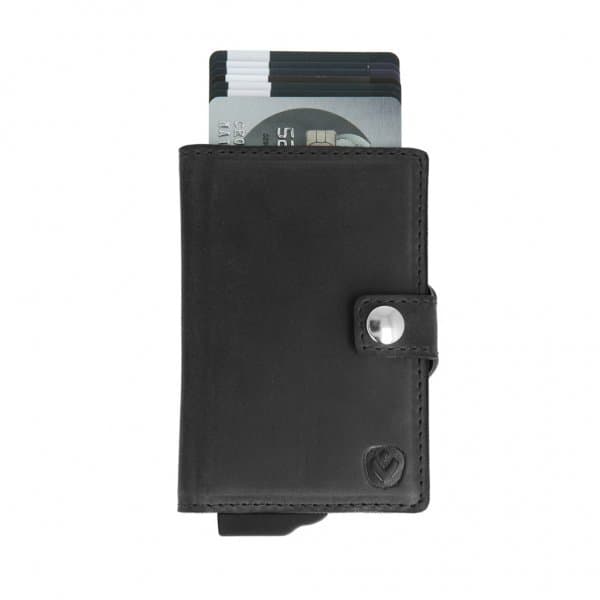 Vakker og luksuriøs skinnlommebok som beskytter kortene dine mot skimming. Denne lommeboken er veldig kompakt og har en luksuriøs finish. Aluminiumsholderen på innsiden kan lagre 6 til 7 kort. I skinndelen er det plass til ytterligere 4 kort og kontanter bak det elastiske båndet. Nederst er det en skyveknapp som lar deg trekke ut kortene i en myk bevegelse. På baksiden er det også plass til et ekstra kort.