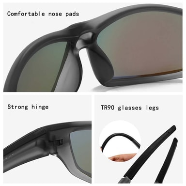 Polariserte linser: Disse sportssykkel solbrillene er utstyrt med TAC polariserte linser som reduserer gjenskinn og forbedrer synskomforten under utendørsaktiviteter. De polariserte linsene beskytter øynene mot skadelig UV-stråling og gir klarere syn, noe som gjør dem perfekte for sykling, fiske og andre sportsaktiviteter.