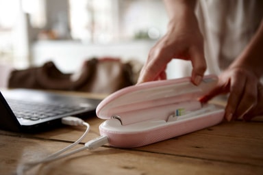 Innovativ lading: Det smarte ladeglasset gjør det mulig å lade den elektriske tannbørsten med stil. La tannbørsten ligge i glasset mens den lader. Har du behov for å lade tannbørsten på reise er USB-ladingen meget praktisk. Putt tannbørsten i etuiet og sett USB-inngangen i etuiet.