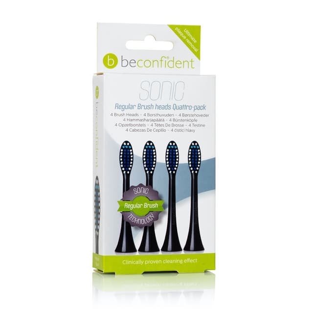 Få renere og hvitere tenner med 4-pakk Beconfident® Sonic Tannbørstehoder Regular Svart. Tannbørstehodet har en innebygd fargepåminnelse når det er på tide å skifte tannbørstehode. Hardhet: vanlig / myk til daglig bruk. Vi anbefaler at du bytter tannbørstehode hver tredje måned for best rengjøring og minst slitasje på emaljen.
