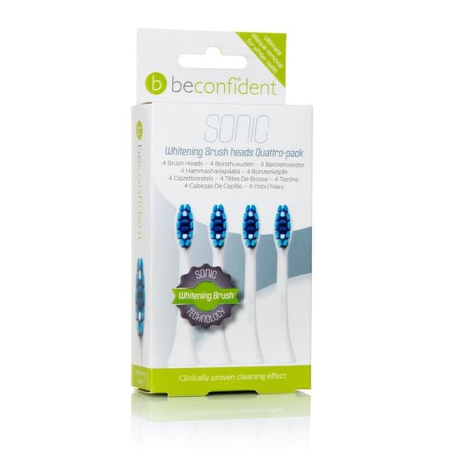 Få renere og hvitere tenner med 4-pakk Beconfident® Sonic-tannbørstehodene Whitening Hvit. Tannbørstehodet har en innebygd fargepåminnelse når det er på tide å skifte tannbørstehode. Dette børstehodet er spesielt designet for å fjerne ytre belegg og gi synlig hvitere tenner. Hardhet: vanlig / middels hardhet til daglig bruk. Vi anbefaler at du bytter tannbørstehode hver tredje måned for best rengjøring og minst slitasje på emaljen.