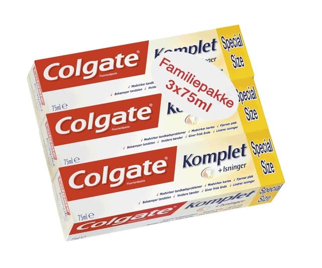 Colgate Komplett gir komplett beskyttelse for tenner og munn. Beskytter mot plakk og styrker tannemaljen. Pakken inneholder tre tannkremtuber.