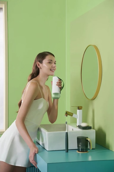 W10 har et moderne beltestildesign som er både elegant og bærbart, noe som gjør den lett å ta med eller oppbevare på badet. Det ergonomiske håndtaket sikrer komfortabel bruk under daglige munnpleierutiner.