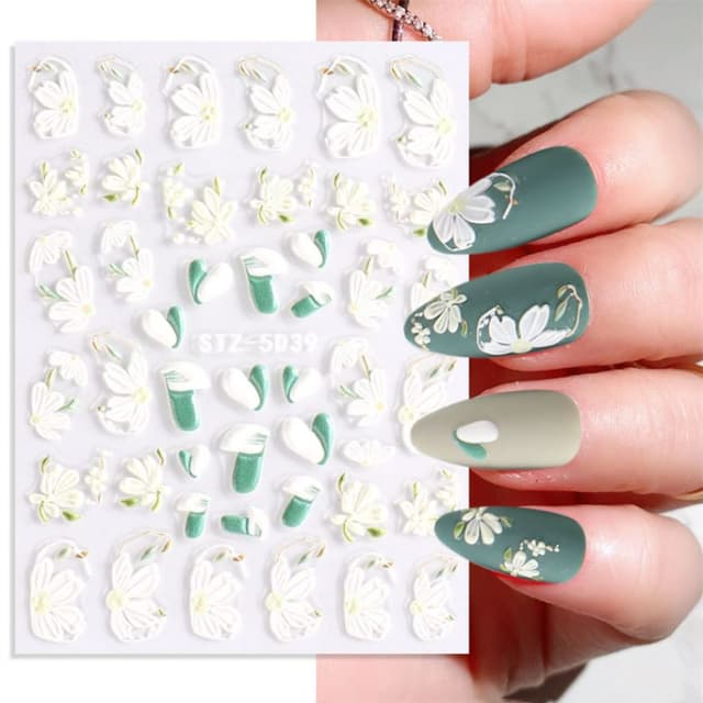 Selvklebende negleklistremerker i preget 5D-design som skaper ekstra fine effekter på neglene. Pakken inneholder et ark med negleklistremerker med ca 50 flotte blomstermotiver.