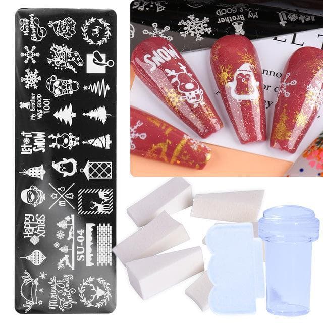 Neglestemplingssett som inneholder en stempelplate, en stempelpute, en skrape og 8 svamper. Et må-ha gjør-det-selv-sett, lag enkelt mønstrene du vil ha på neglene og nyt moroa med neglekunst.