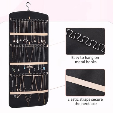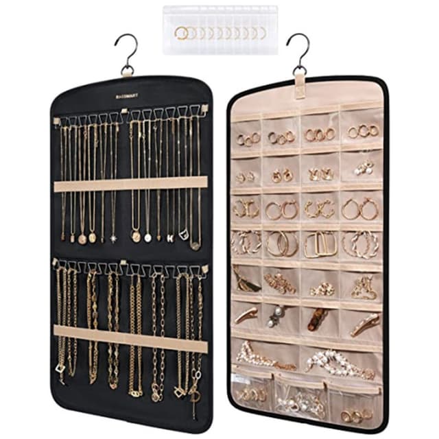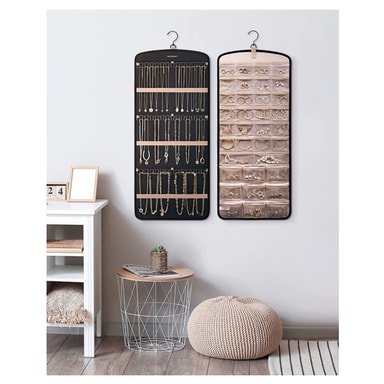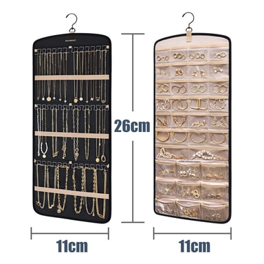 Dobbeltsidig hengende design: Smykkeoppbevaringen har god plass til alt tilbehøret ditt. Den er designet med mange klare lommer for å holde orden på ringer, øredobber, armbånd, klokker og hårspenner og gjør det enkelt å finne det du leter etter. Den andre siden er designet for oppbevaring av halskjeder.