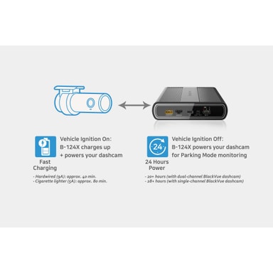 Blackvue power magic batteri ultra 6000 mah. Rask lading. Langvarig. Tilkoblet.. Fast installasjon eller via 12v-uttak. Battery manager app support. Ekspansjonsbatteri med dobbel kapasitet. 12v / 24v-kompatibilitet, usb-utganghurtiglading. Langvarig. Tilkoblet power magic ultra-batteriet lades opp når tenningen er på, og slår på bilkameraet når tenningen er slått av. Rask lading: power magic ultra-batteriet når en hurtig lading på 40 minutter når det er permanent installert (80 minutter hvis det er koblet til sigarettenneruttaket). Langvarig: parkeringsmodus kan vare mer enn 24 timer med en enkanals blackvue. Tilkoblet: kompatibel med den gratis blackvue battery manager-appen. Fast installasjon eller via 12v-uttak power magic ultra-batteriet støtter to lademodus. Enkel installasjon: bare koble batteriet til sigarettenneruttaket på bilen din. Ladestrøm: 5a - ladetid: ca. 80 minutter. Fast installert: for raskest ladehastighet, koble batteriet til sikringspanelet. Ladestrøm: 9a - ladetid: ca. 40 minutter. Battery manager app support sjekk detaljert batteristatus fra telefonen power magic ultra battery støtter bluetooth for kompatibilitet med den gratis dedikerte blackvue battery manager-appen (ios / android). Ved lading viser appen ladeprosent, ladespenning og forventet gjenværende tid til full lading. Når tenningen er slått av, varsler appen deg om forventet batteridrift for resten av eksosstillingen, basert på bilkameraets strømforbruk. Ekspansjonsbatteri for dobbel kapasitet utvidelsesbatteriport: du kan koble et utvidelsesbatteri til power magic ultra-batteriet til mer enn doble kapasiteten og parkeringsmodusen. Utvidelsesbatteriet (b-124e) kan lagre opptil 6600 mah strøm, så 10% mer energi enn ultra-batteriet. Flere utvidelsesbatterier kan kobles etter hverandre for å gi enda større kapasitet. 12v/24v-kompatibilitet, usb-utgang power magic ultra-batteriet (b-124x) støtter både 12v og 24v elektriske systemer. Dette betyr at den er kompatibel med de fleste individuelle og kommersielle eller tunge kjøretøyer på markedet. 5v usb (2a maks): med sin usb-utgang kan du lade ethvert tilbehør, for eksempel en telefon eller et wi-fi-hotspot for å holde bilkameraet tilkoblet i parkeringsmodus. Spesifikasjoner farge / størrelse / vekt: svart / 157 mm (b) x 171 mm (l) x 39,5 mm (h) / 1,4 kg battericelle type: lifepo4 inngangsspenning / strøm 12v-system: sigarettennerplugg: 12 v - 17 v / 6,5 a (maks) fast installert: 12 v - 17 v / 13,5 a (maks) 24v-system: sigarettennerplugg: 23 v - 30 v / 3.4 a (maks) fast installert: 23 v - 30 v / 7.1 a (maks) ladespenning / strøm sigarettennerplugg: 14,2 v / 5 a fast installert: 14,2 v / 9 a ladetid: sigarettennerplugg (standard 5 a lading): ca. 80 minutter fast installert (hurtig 9 a lading): ca. 40 minutter driftstid: ca 25 timer og 35 minutter (basert på et enkelt bilkamera som bruker 3 w) driftstemperatur ladetemperatur: 0° c - 45° c utslippstemperatur: -10° c - 60° c lagringstemperatur: -20° c - 45° c avstenging ved for høy temperatur: ca. 80° c kapasitet: 12,8 v / 6000 mah / 76,8 wh utgangsspenning / strøm dashcam-port: 11v - 14.2v / 2a (maks) usb-port: 4,75 v - 5,25 v / 2 a (maks)