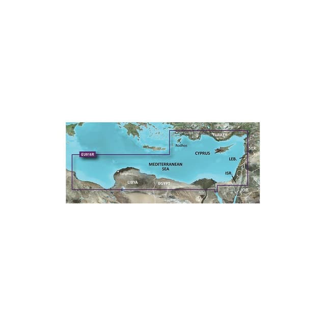 Premium sjøkart Bransjeledende dekning, klarhet og detaljer med oppdaterte sjøkart som har integrert Garmin- og Navionics ® -innhold Auto Guidance 1 -teknologien beregner raskt en foreslått rute ved hjelp av ønsket dybde og høydeklaring Inkluderer skyggelegging av opptil 10 dybdeområder som gir deg muligheten til å få en rask oversikt over ønsket dybde Konturer på opptil 30 cm (1 fot) gir en mer nøyaktig beskrivelse av bunnstrukturen for forbedrede fiskekart Med funksjonen for skyggelegging av grunt vann kan du skyggelegge på en brukerdefinert dybde for å få et klarere bilde av grunne farvann du bør unngå Få enestående dekning og detaljer når du er på sjøen. BlueChart g3 Vision-kartene har bransjeledende dekning, klarhet og detaljer med integrert Garmin- og Navionics-innhold. Auto Guidance Få en rute som viser deg veien og hindringer i nærheten på en sikker dybde 1 – enten du er på fisketur eller båttur. Skyggelegging av dybdeområde Denne funksjonen viser skyggelegging av dybdeområder i høy oppløsning for opptil 10 dybdeområder, slik at du kan vise din ønskede dybde. Skyggelegging av grunt vann Med funksjonen for skyggelegging av grunt vann kan du skyggelegge på brukerdefinert dybde for å få et klarere bilde av grunt vann du bør unngå. Detaljerte konturer BlueChart g3 Vision-kartene har konturer på 30 cm (1 fot) som gir en mer nøyaktig beskrivelse av bunnstrukturen for forbedrede fiskekart og detaljer i våtmarker, kanaler og havner. Satellittbilder Satellittbilder med navigasjonskartoverlay gir deg et realistisk bilde av omgivelsene. Dette er den mest realistiske kartvisningen vår på en kartplotter. Den er ideell når du navigerer i ukjente havneområder. FishEye-visning Dette undervannsperspektivet viser et 3D-bilde av bunnen og konturer under vannlinjen. Grensesnitt med ekkoloddata for en tilpasset visning. MarinerEye-visning Denne visningen viser et 3D-bilde av omgivelsene over og under vannlinjen. Flyfoto Krystallklare flyfoto viser deg et detaljert bilde av en rekke havner og småbåthavner. Det er ideelt når du navigerer i ukjente havneområder. 1 Auto Guidance skal bare brukes til planlegging og erstatter ikke ansvaret ditt for å navigere fartøyet på en sikker måte Dekning Från Güllük, Turkiet öster till att omfatta Cypern, Syrien, Libanon och Israel, sedan västerut till Misratah, Libyen.